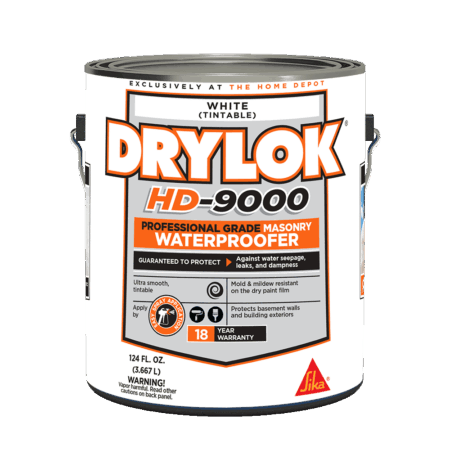 DRYLOK® HD-9000 is a The Home Depot® Exclusive professional grade masonry waterproofer featuring Flexible Encapsulated Polymers that protect the masonry surface and aesthetic integrity by providing a waterproof barrier to water movement into or out of the structure. DRYLOK HD-9000 is specially formulated to resist mildew growth on the dry paint film with the incorporation of a biocide. DRYLOK HD-9000 is ideal for basements, stucco, masonry pools, cinder block, poured concrete, and more. An extensive tintable color palette makes DRYLOK HD-9000 a 1‑step solution for waterproofing and beautification.