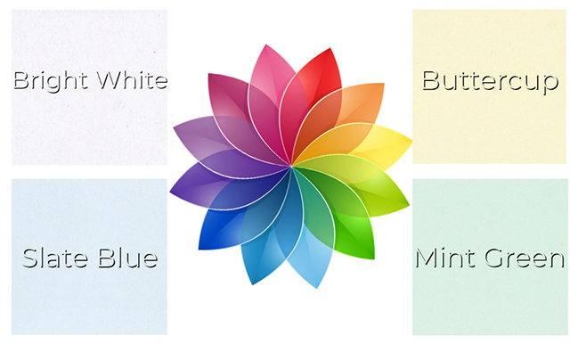 The cool blue shade of Slate Blue symbolizes serenity and stability. Mint green represents tranquility and has a calming effect, and the Bright White symbolizes new beginnings and a fresh start. Contrast it with the sunny yellow shade of Buttercup that suggests harmony and the promise of renewal.